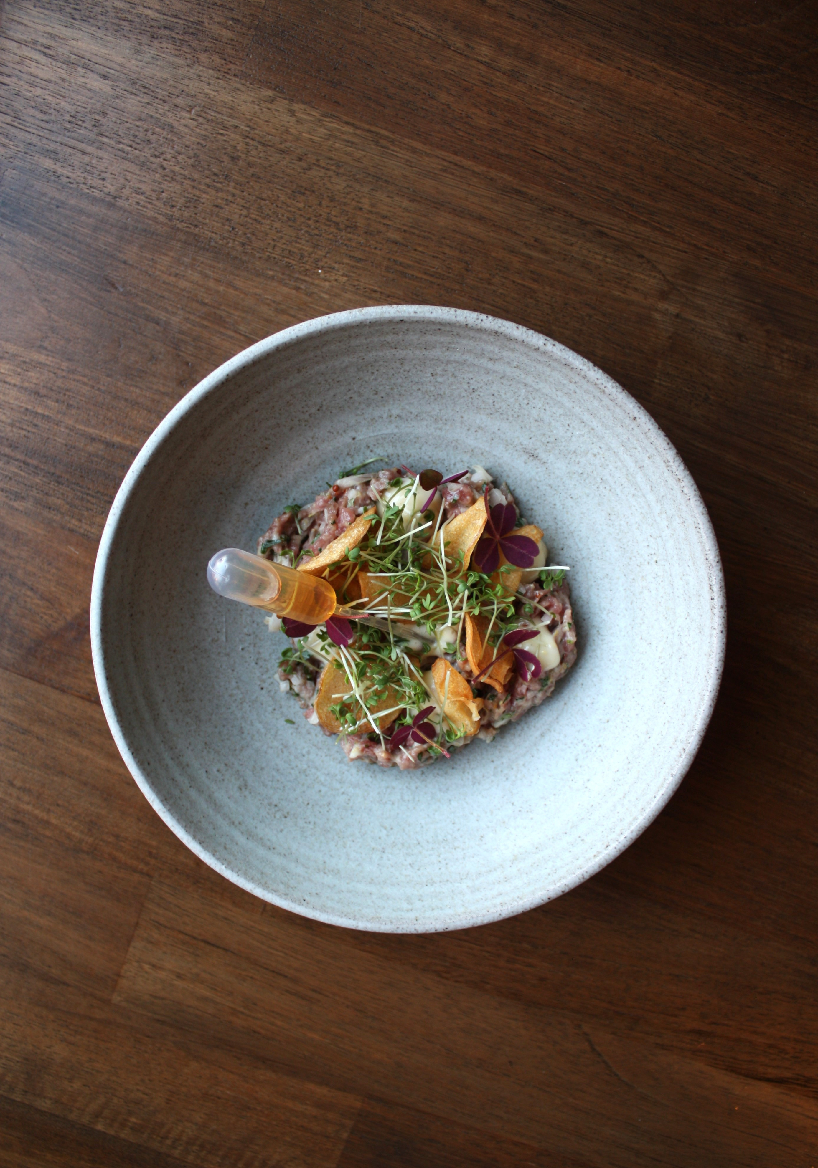 Som mellemret kan gæsterne nyde rørt tartar med cognac, estragon, skalotteløg, sennepsmayo, karse og kartoffelchips. Hovedretten består af farseret vagtel med Pommes Anna, fumé sauce med morkler og tyttebær, samt grillede marinerede skalotteløg.